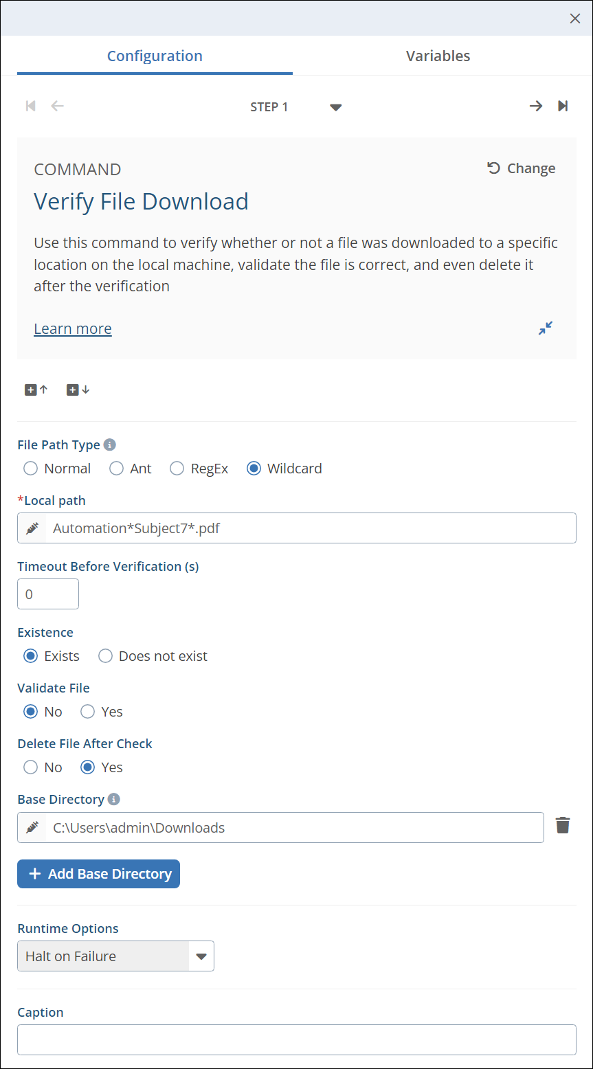 If you have a test case that downloads a file where the name changes (may include dynamic dates or numbers that you can't predict), you can use parts of the name to verify this file.