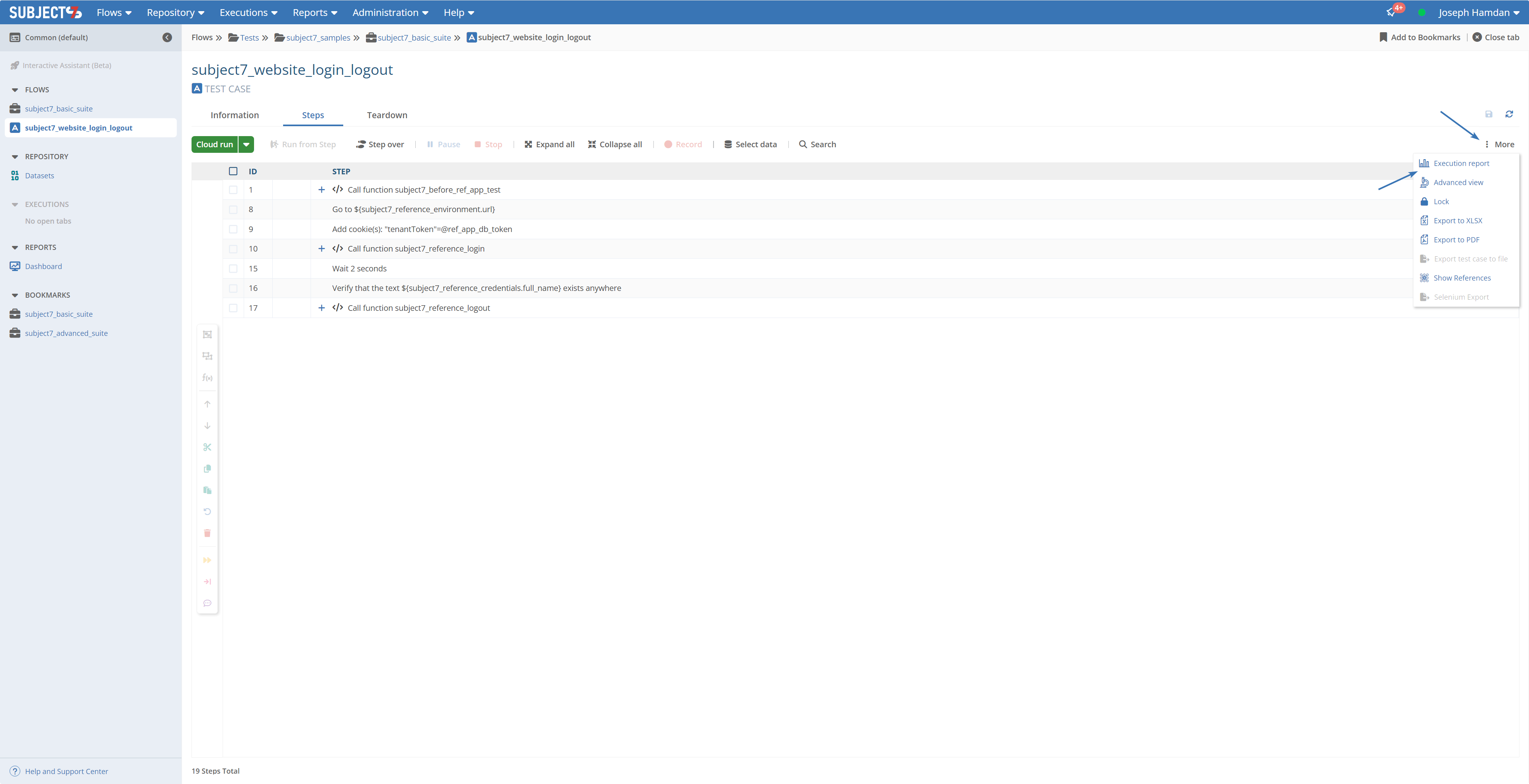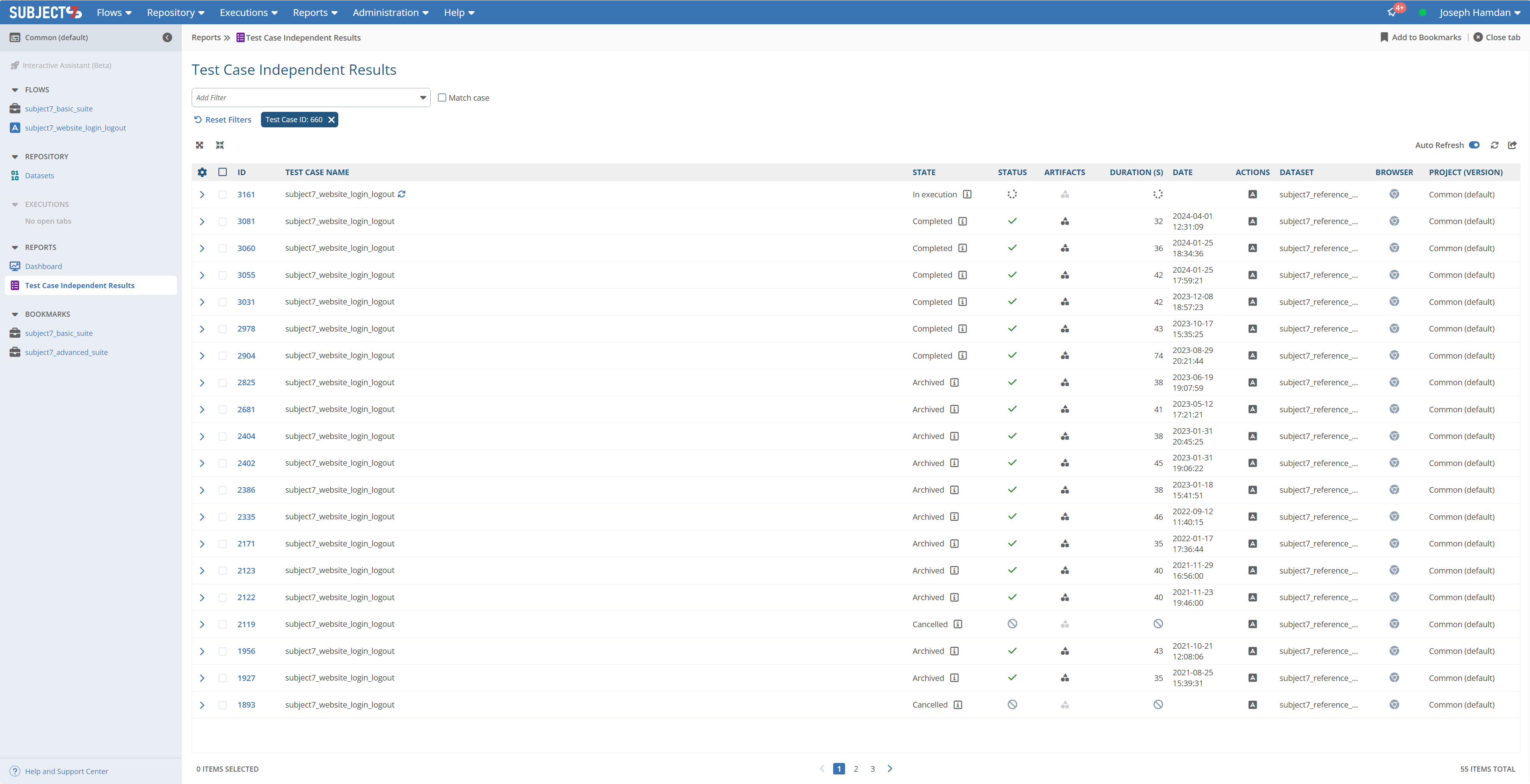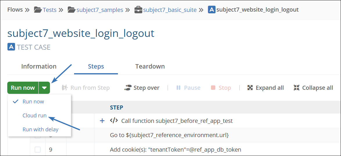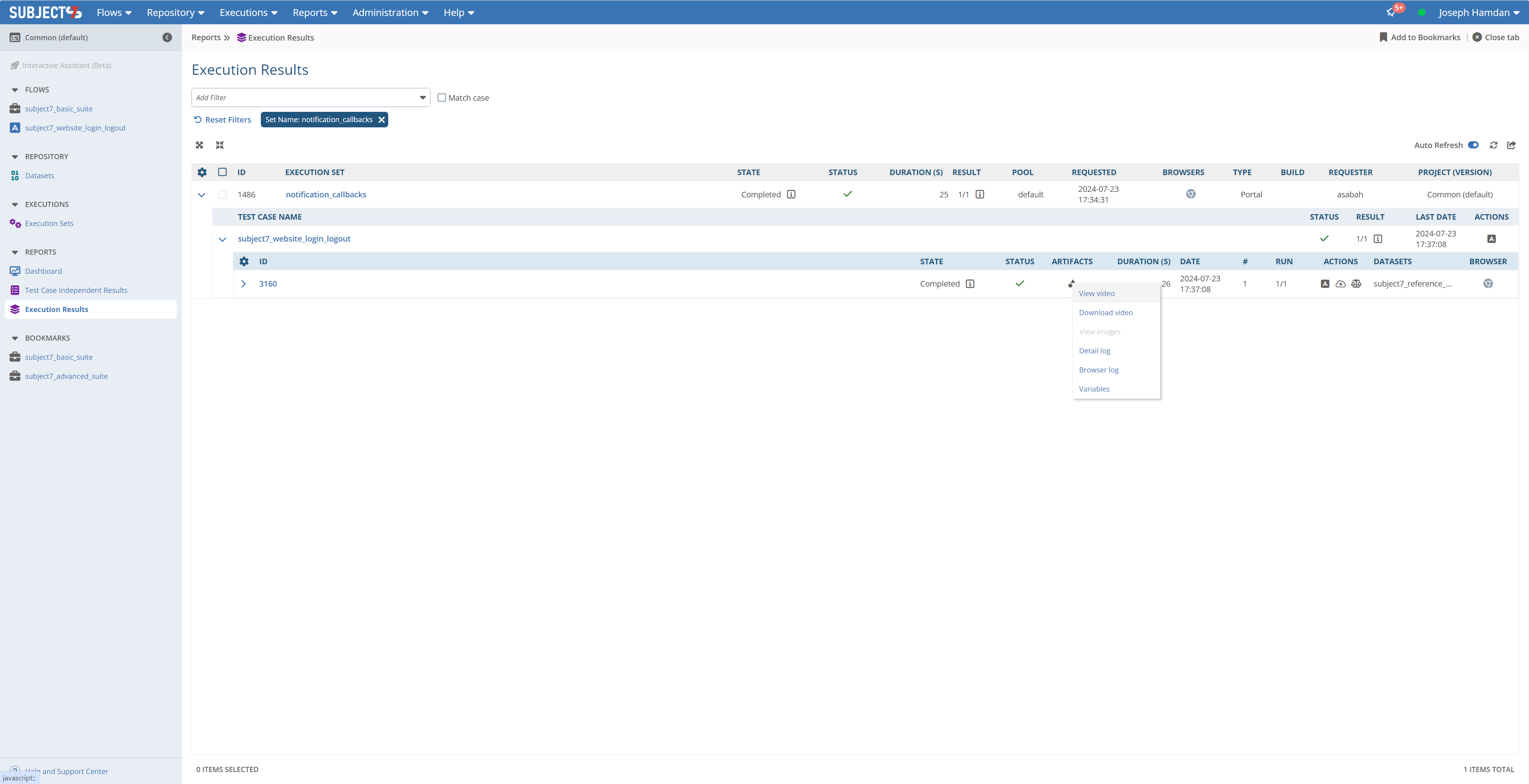 4- The Execution Report will show you the latest cloud runs initiated for this test case. You can click on the arrow next to each execution to view detailed steps. Under Artifacts, you can find additional resources which include a video of the execution, a snapshot, a detail log and a list of variables.