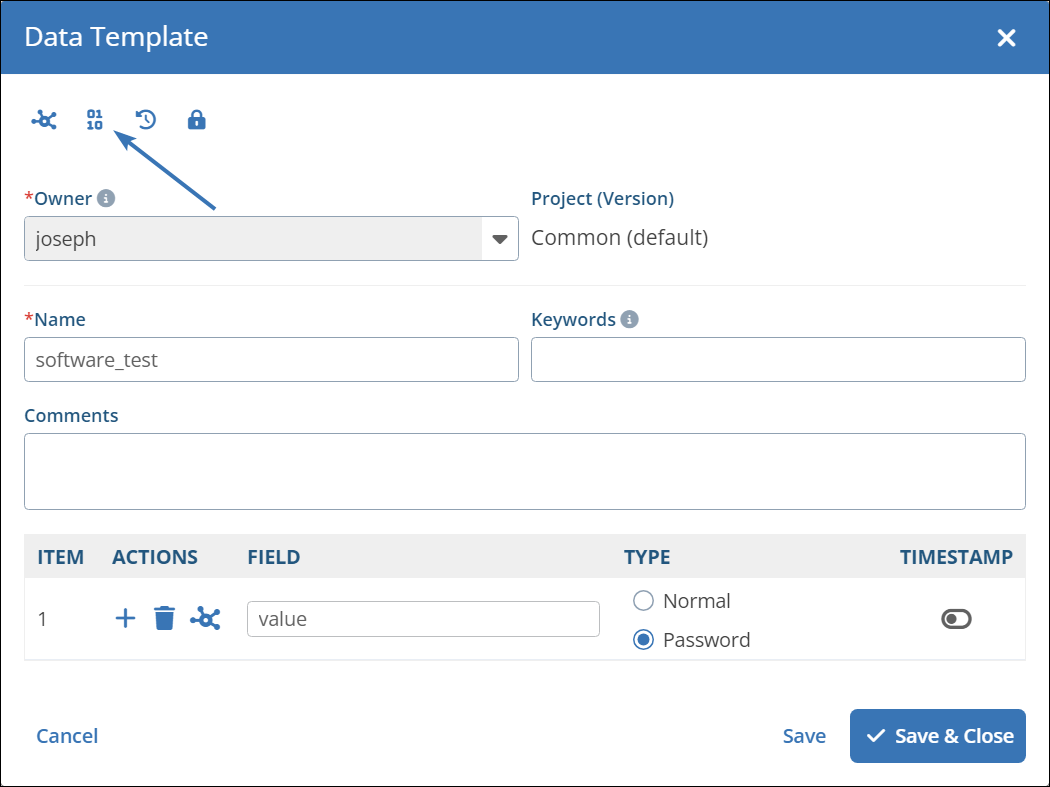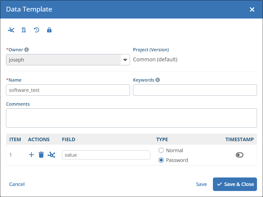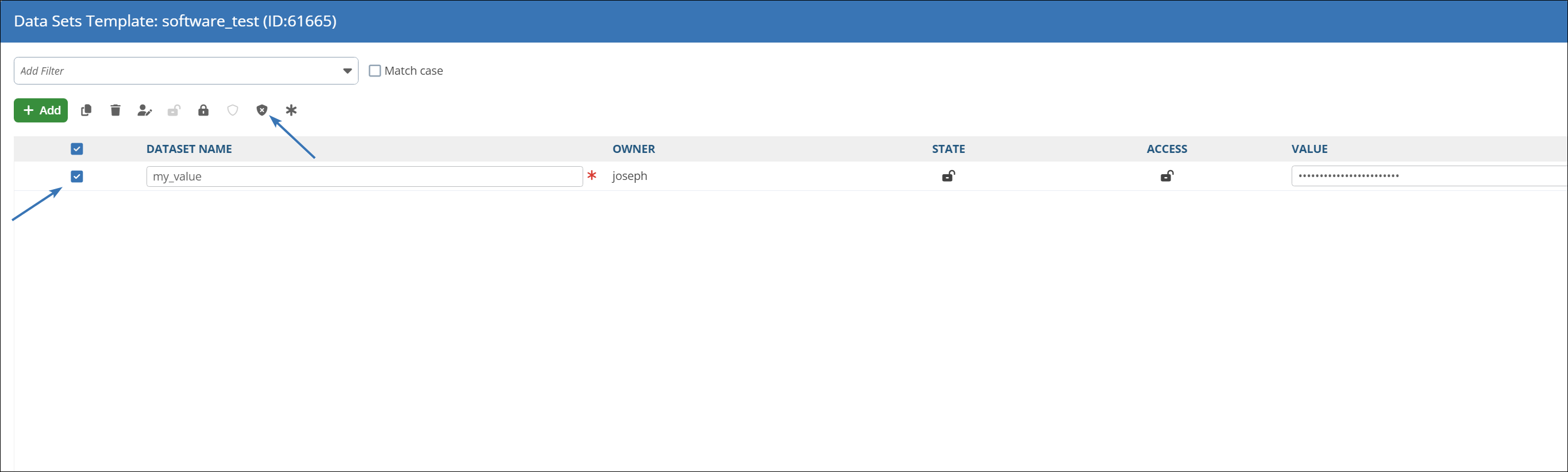 - With the box checked (from step 9), select the shield with an X to "Restrict dataset usage". This will allow only the owner user to use the dataset in a test case