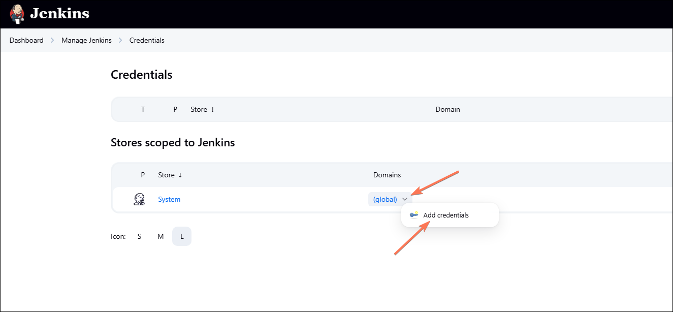 5. After the plugin is installed, you need to create a credential. Go to Manage Jenkins > Configure Credentials on the left menu in Jenkins.