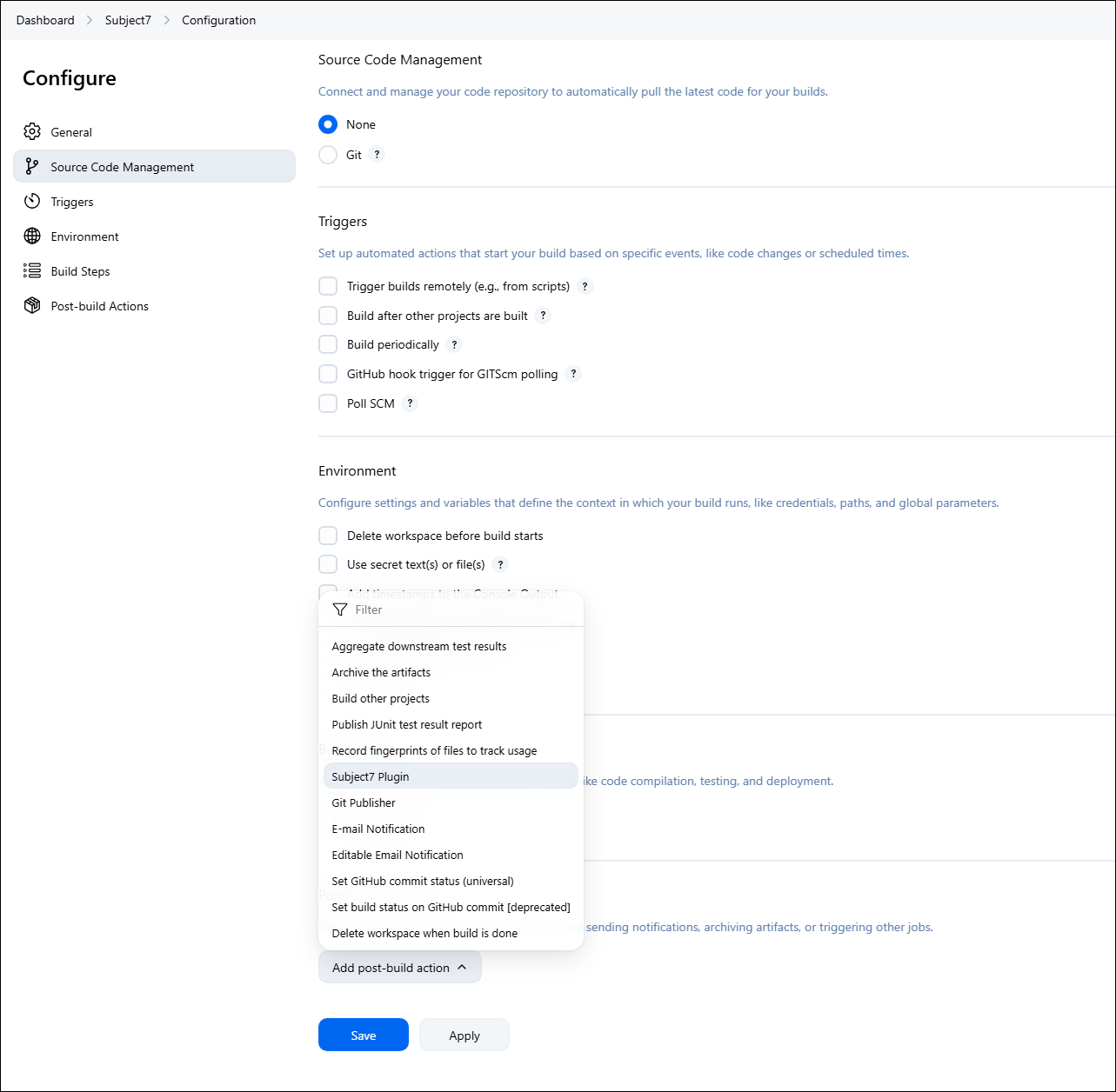 1. Subject7 should now appear in the post-build action after creating a new project on Jenkins:
