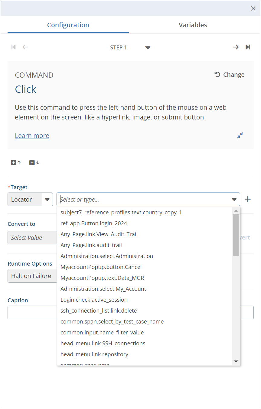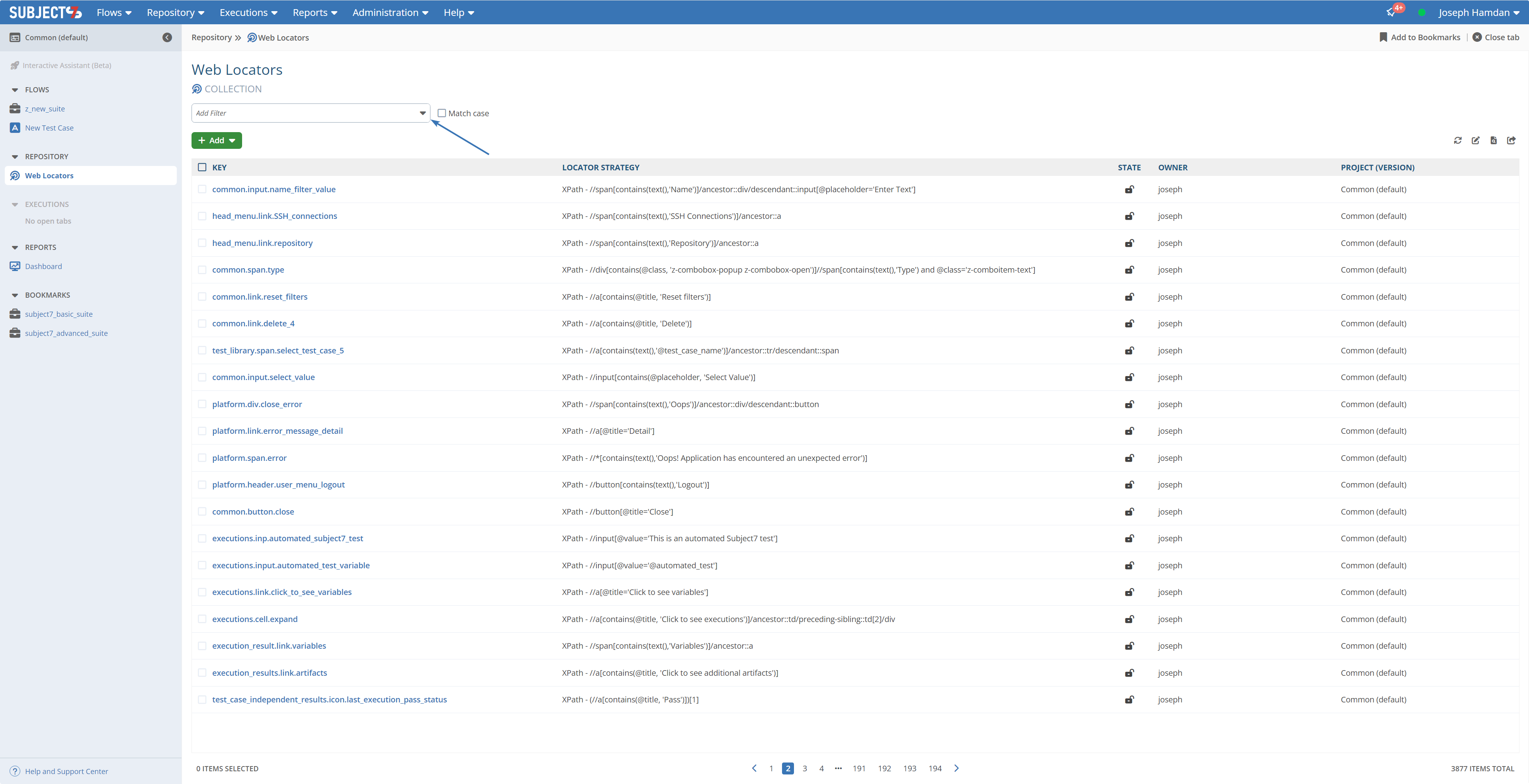 - In the Locator field, do a partial search. This field uses the Key format for the Web Locator name: <web page>.<type>.<alias> For example these are valid search terms for this field:
