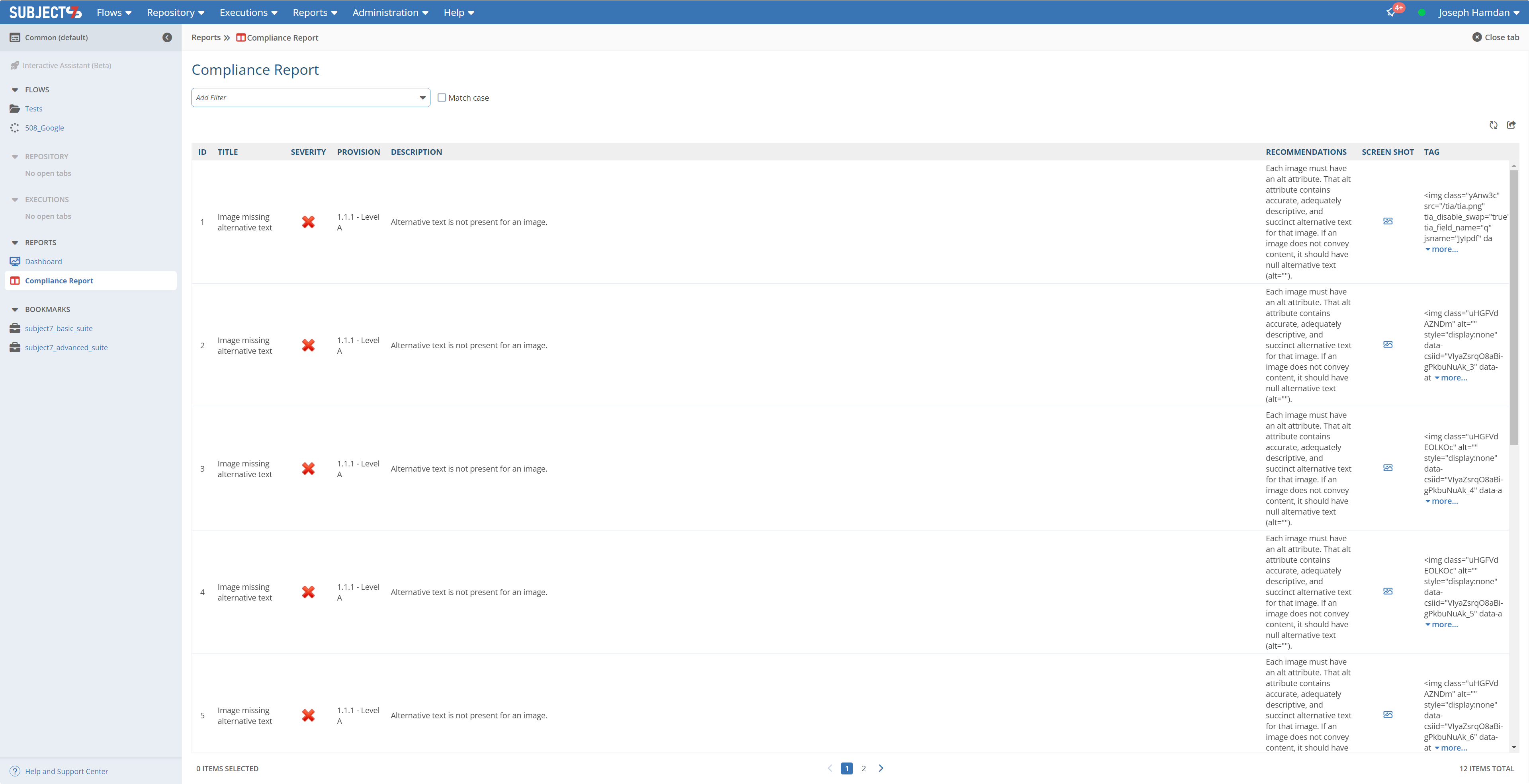 5. Once the report is opened, each issue contains a number of columns including the severity, description of issue, recommendations to fix the issue, a screenshot, and the HTML tag that produced the issue.
