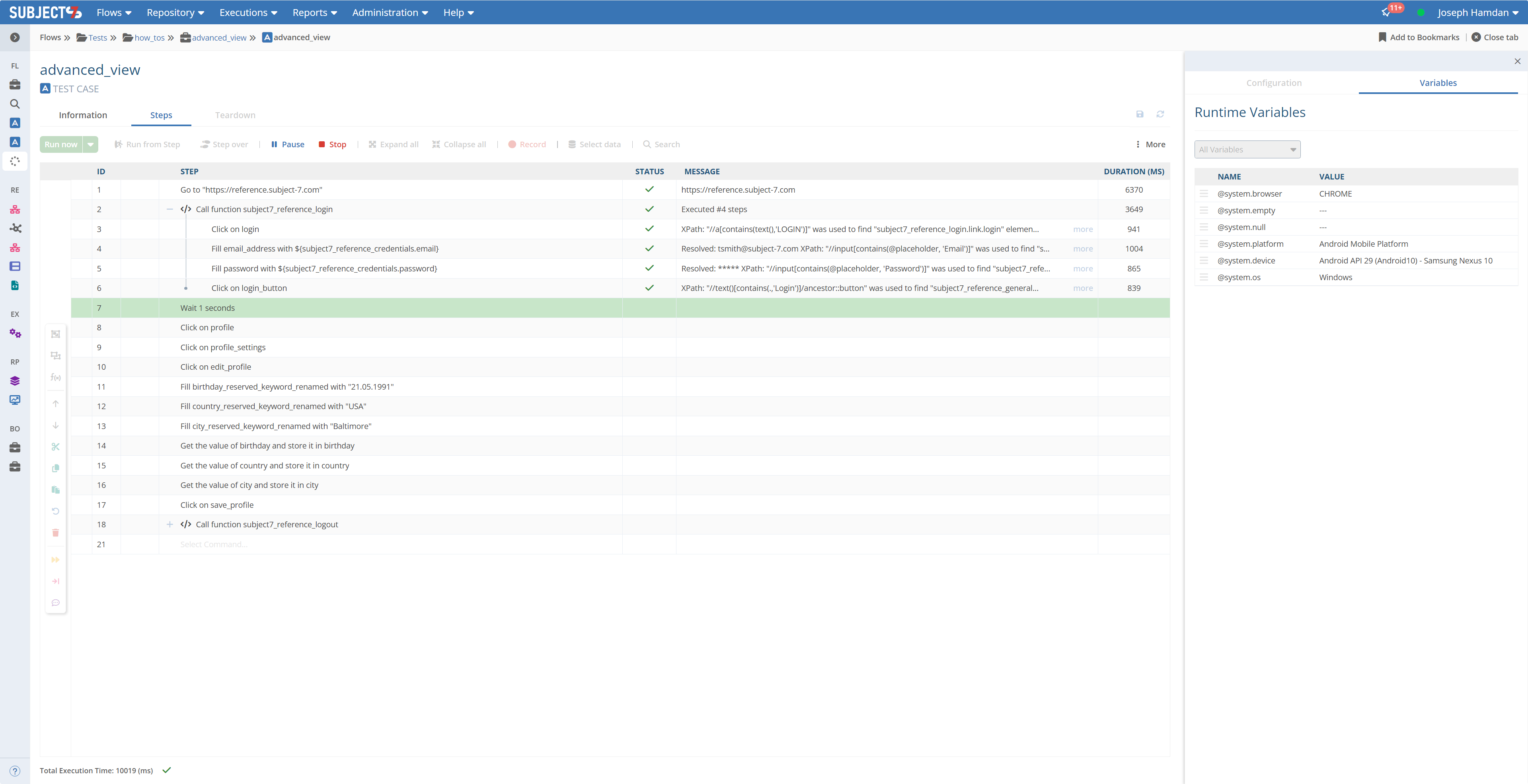 5- Execution will start and the watch window (Runtime Variables) will appear on the right side to show you any defined variables in your test. The Status field will start updating with green checkmark to indicate successful step completion, red X to indicate failures/errors or orange checkmark to indicate failures that were skipped to prevent stopping the entire execution.