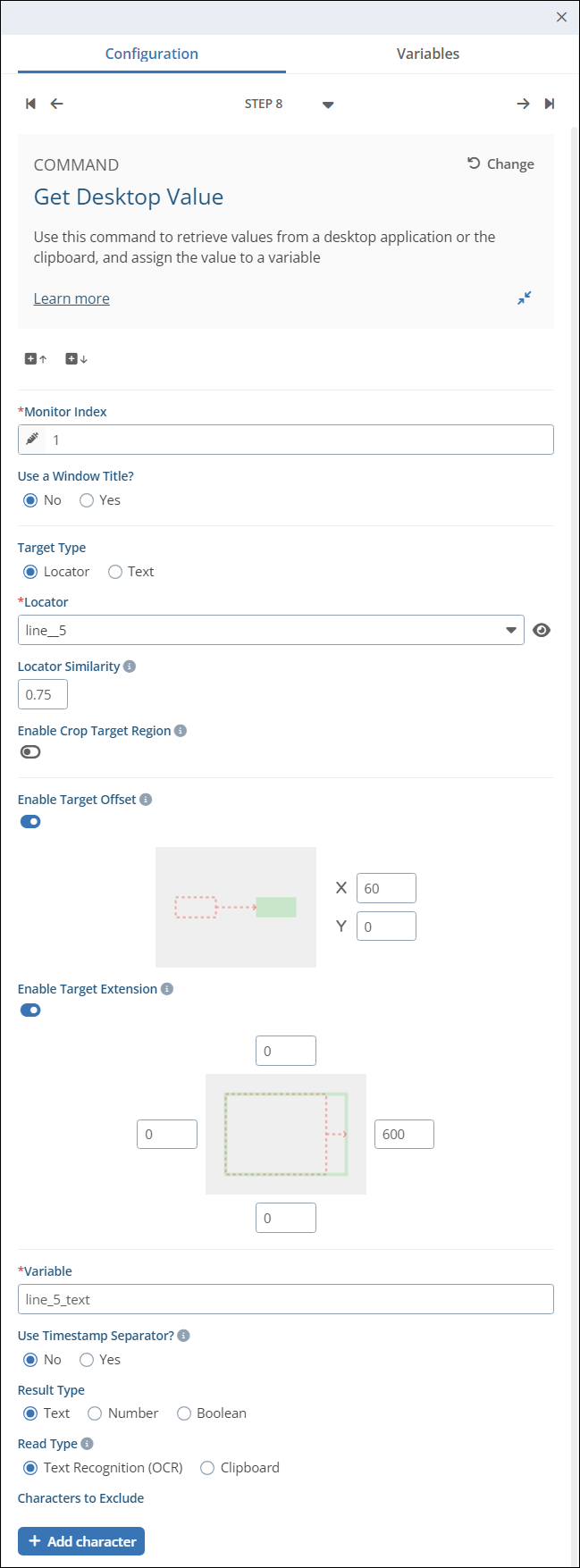 Procedure: Define steps that lead up to the point where the document is opened. Then use Get_Desktop_Value command, enter a variable name, select “Text Recognition” as Read Type and select “Text” as Result Type. The reference point in this command is “Line 5:”, so we will need to define a Desktop Locator for this text only. Once a Desktop Locator is defined, we will need to determine how to move from “Line 5:” to the text next to it using Offset points and extend the region dimensions using Extension field. For the purpose of this example, we used 60 horizontal offset points ( X ) and 600 extension points to the right. The step will look as below: